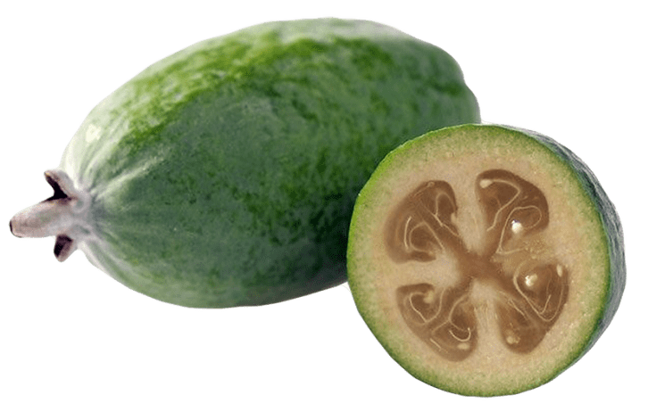La feijoa (Acca sellowiana), également connue sous le nom de goyave du Brésil, est un fruit originaire des régions montagneuses du Brésil, de l’Argentine, du Paraguay et de l’Uruguay, bien qu’il soit également cultivé dans d’autres pays au climat tempéré, comme la Nouvelle-Zélande et la Colombie. La feijoa a une peau verte terne et une forme ovale, semblable à celle d’une petite goyave. Sa pulpe est juteuse et aromatique, avec une texture crémeuse au centre, et son goût rappelle un mélange d’ananas, de fraise et de goyave, avec une légère acidité.